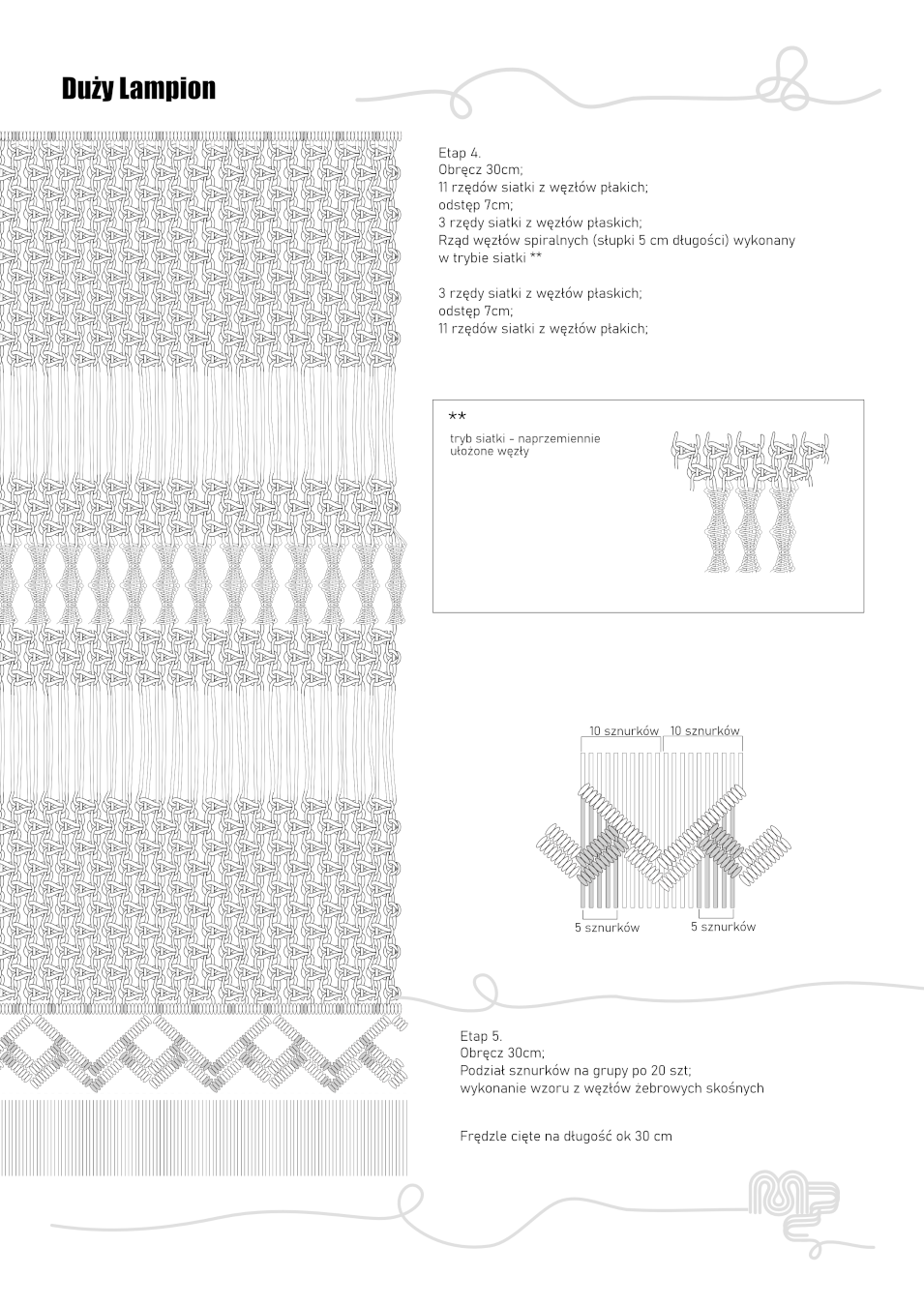 Plik pdf zawiera 3 strony z opisem cięcia sznurków, ich rozmieszczenia, wykorzystania węzłów i przycinania frędzli. Jest uzupełnieniem tutoriala i wideo tutoriala „Lampion ogrodowy” https://youtu.be/VyuaF55GD2Q
